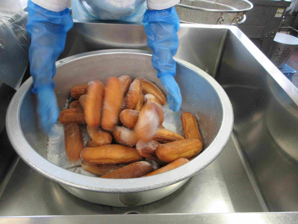 投稿日: 2025年10月23日2025年10月23日10月23日(木) 今日の献立は、揚げパン・牛乳・ポトフ みかんでした。 揚げパンは、コッペパンを少しずつフライヤーに入れて 浮かんでくるパンを、上から押さえてしっかり揚げます。 グラニュー糖をたっぷりからめて出来上がり。