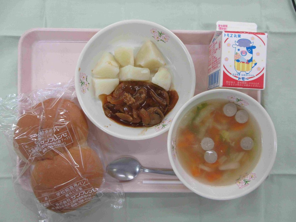 今日の献立は、子供パン・牛乳・ハンバーグデミグラスソース