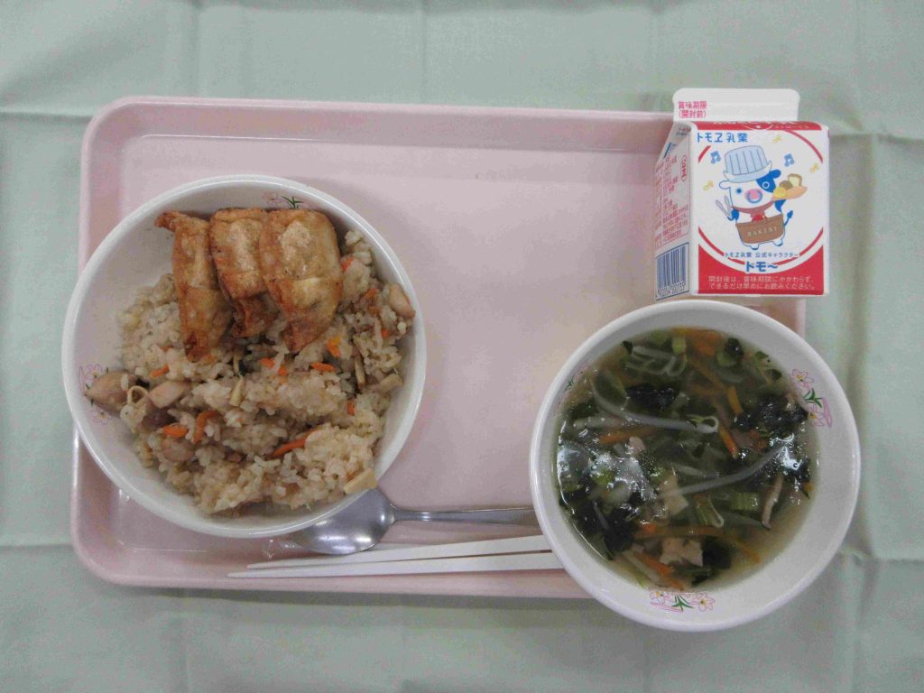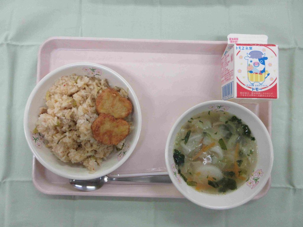 今日の献立は、キムタクごはん・牛乳・チキンナゲット