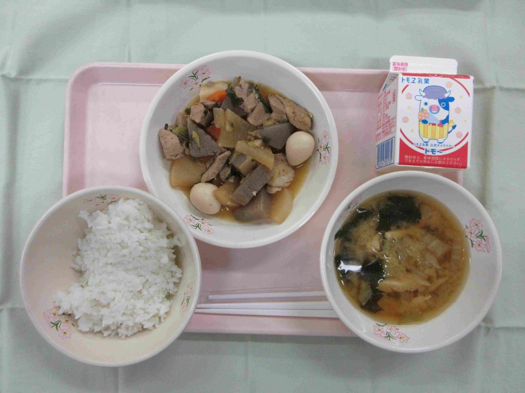 今日の献立は、ごはん・牛乳・豚肉とうずらの卵のうま煮
