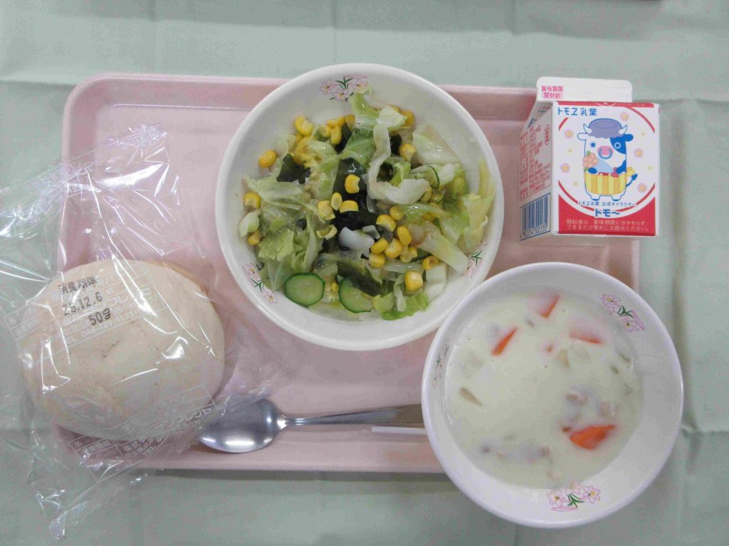 今日の献立は、メロンパン・牛乳・ホワイトシチュー