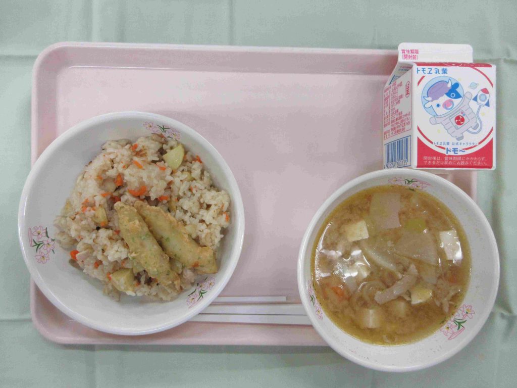 今日の献立は、くわいごはん・牛乳・わかさぎの天ぷら