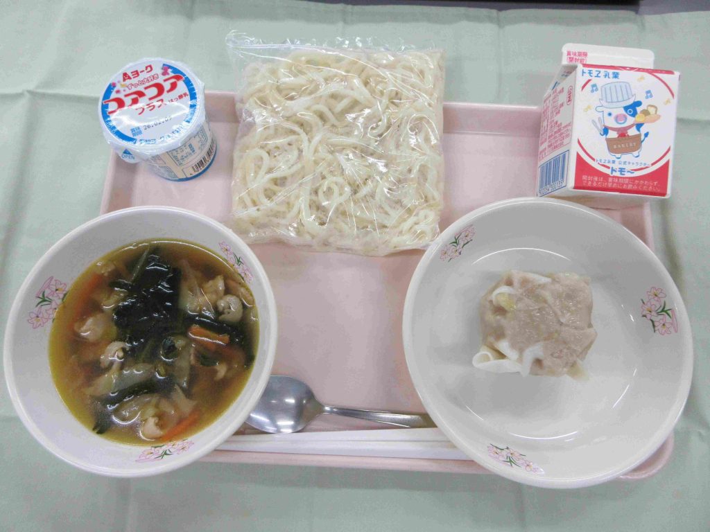 投稿日: 2026年1月28日2026年1月28日1月27日(火) 今日の献立は、五目ラーメン・牛乳・手作りしゅうまい ヨーグルトでした。 しゅうまいは、ひき肉とたまねぎを混ぜて640個の 肉のボールを作ります。しゅうまいの皮をのせてから アルミカップにのせて蒸しました。調理員さんが、 1つ1つ丁寧に作ってくれたしゅうまいは子供たちに 大人気で「おいしい、おいしい」と言って残さず 食べていました。