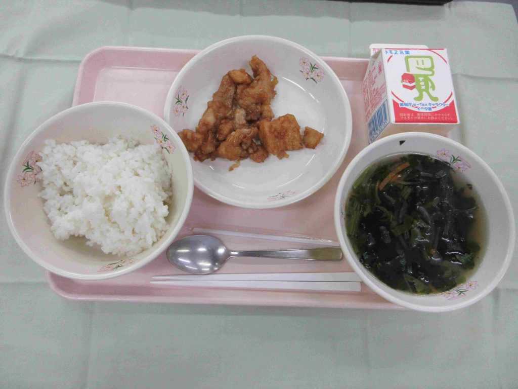 今日の献立は、ごはん・牛乳・ユーリンチー・わかめスープ
