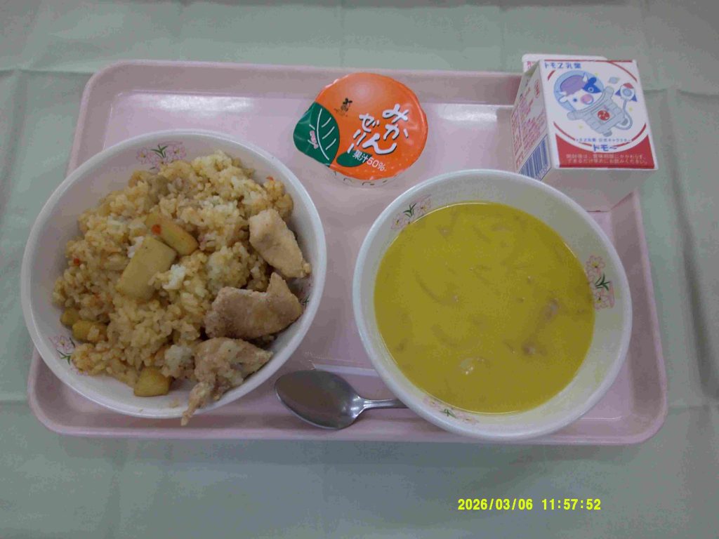 今日の献立は、パエリア・牛乳・ガーリックチキン