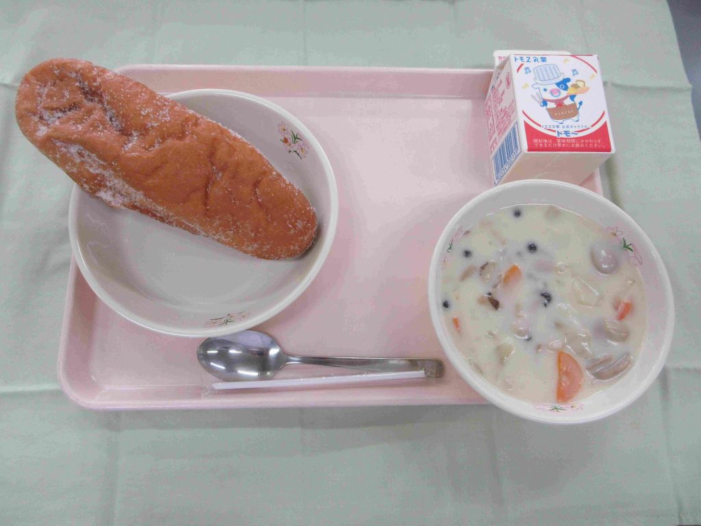 今日の献立は、揚げパン・牛乳・きのこのクリーム煮