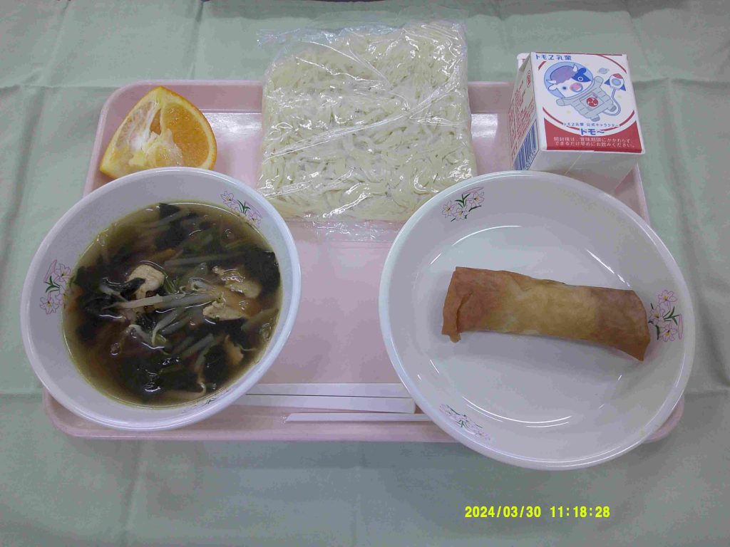 今日の献立は、もやしラーメン・牛乳・春巻・いよかん